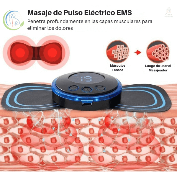Colócalo, elige uno de sus 8 modos y ajusta entre 19 niveles de intensidad. En 15 min se apaga solo. Es ligero, ergonómico, resistente al desgaste y portátil, recargable por USB , para usarlo en cuello, hombros, brazos y piernas. 🔋