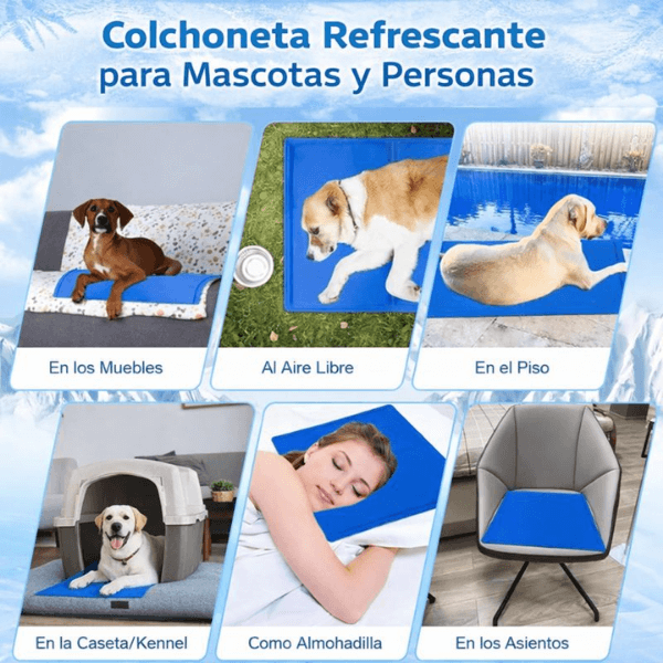 2️⃣ Déjalo acostarse encima y listo: El gel se activa con su peso y empieza a refrescar ❄️
