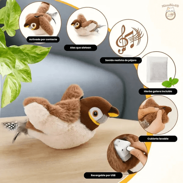 MiauBird® despierta su instinto cazador con movimiento y sonido 🔊 para que juegue más, se aburra menos y se mantenga entretenido en casa 🏡